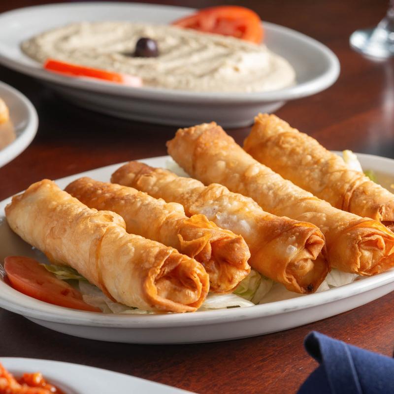 Five pieces of flaky filo dough filled with feta cheese and parsley, then fried golden brown.