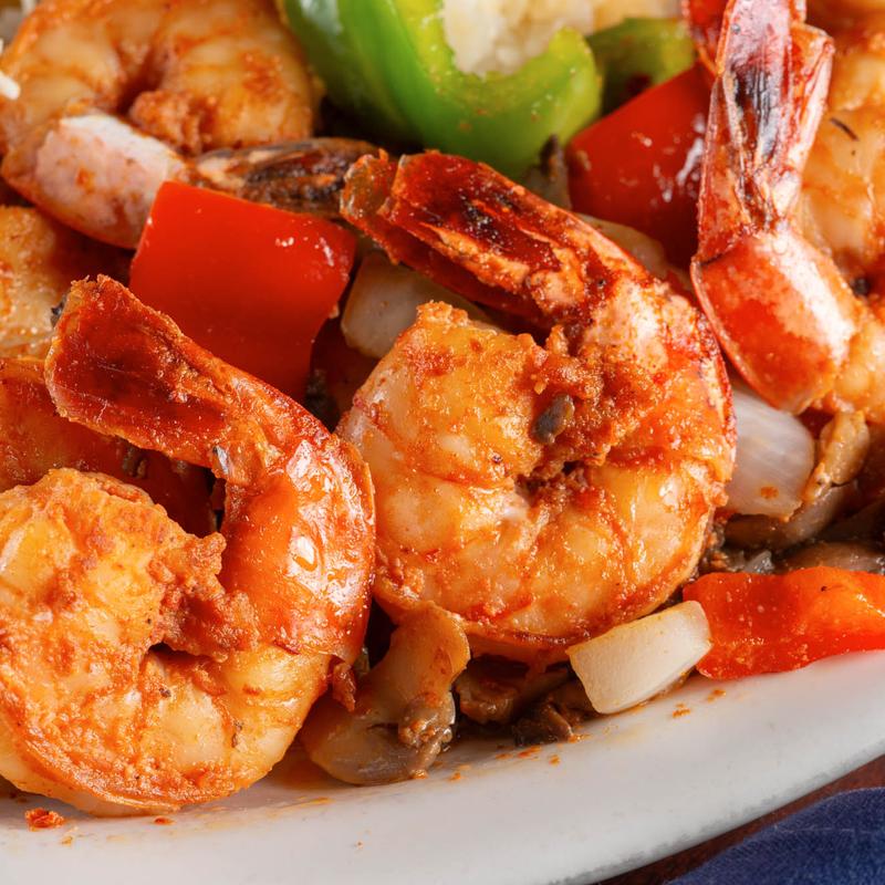 Shrimp sautéed with bell peppers, tomatoes, mushrooms, and onions. Served with rice and cabbage salad.