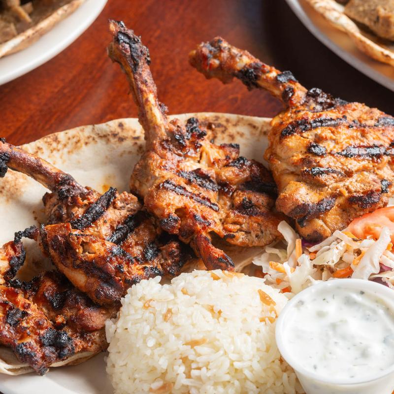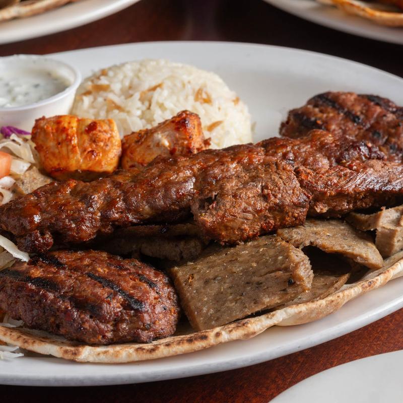 Mixed grilled combination of chicken shish, beef shish, meatball patties, adana kebab, and gyro.